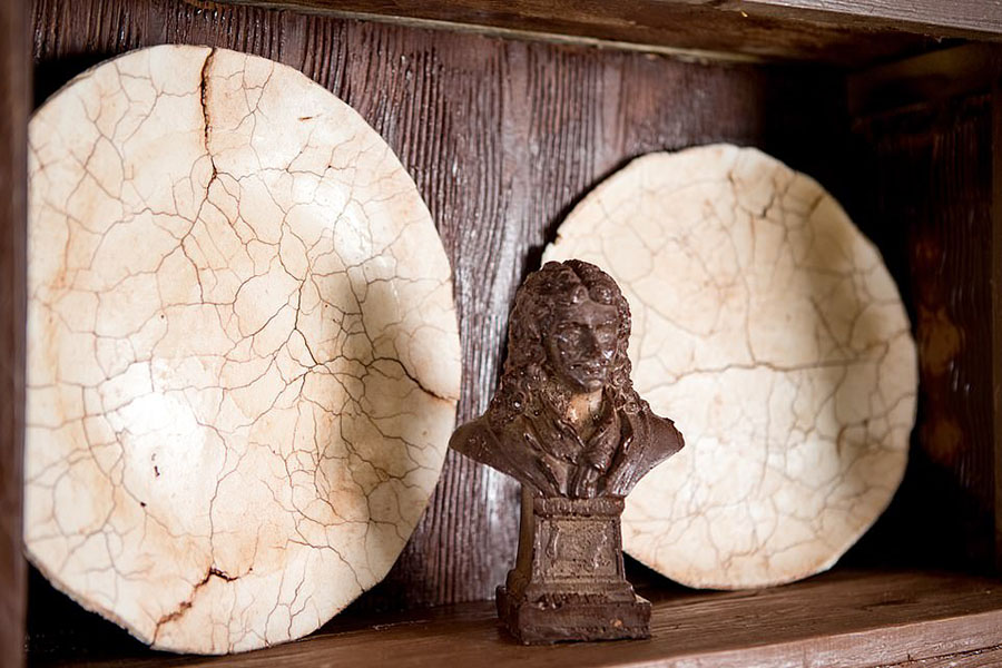 由巧克力制成的装饰品摆放在由巧克力制成的架子上。
