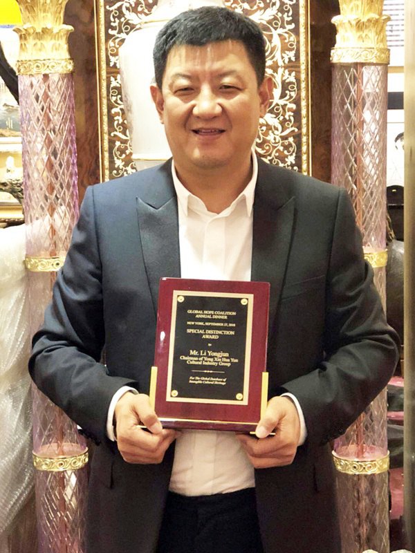 李永军先生代表亚洲地区在致辞中表示,全球希望联合会在亚洲地区的工作致力于非遗的传承、保护与创新发展。作为联合国教科文组织全球领域的合作伙伴,永新华韵团队搭建全球非遗大数据平台,用创新发展的模式进行非遗传承与保护。大会授予永新华韵文化产业集团主席李永军先生“全球非遗大数据建设杰出贡献奖”。
