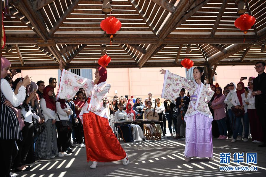 10月8日,在位于开罗的埃及博物馆内,开罗大学孔子学院的学生表演舞蹈。 开罗大学孔子学院文化日活动8日走进埃及博物馆,以书法、武术、剪纸等形式展示中国传统文化。 新华社记者邬惠我摄
