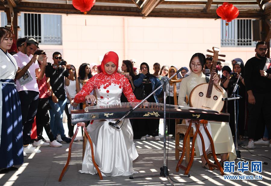 10月8日,在位于开罗的埃及博物馆内,开罗大学孔子学院的学生演奏中国民族乐器。 开罗大学孔子学院文化日活动8日走进埃及博物馆,以书法、武术、剪纸等形式展示中国传统文化。 新华社记者邬惠我摄
