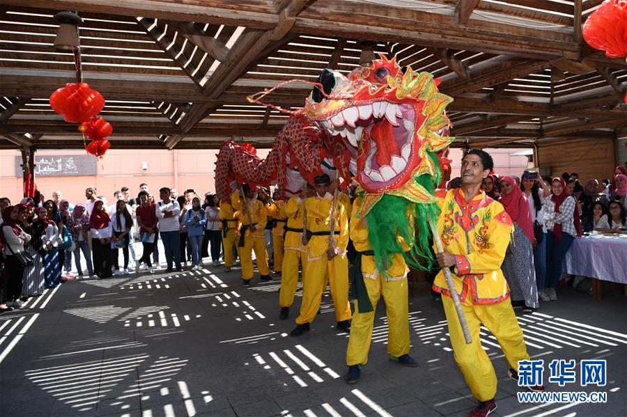10月8日,在位于开罗的埃及博物馆内,人们表演舞龙。 开罗大学孔子学院文化日活动8日走进埃及博物馆,以书法、武术、剪纸等形式展示中国传统文化。 新华社记者邬惠我摄