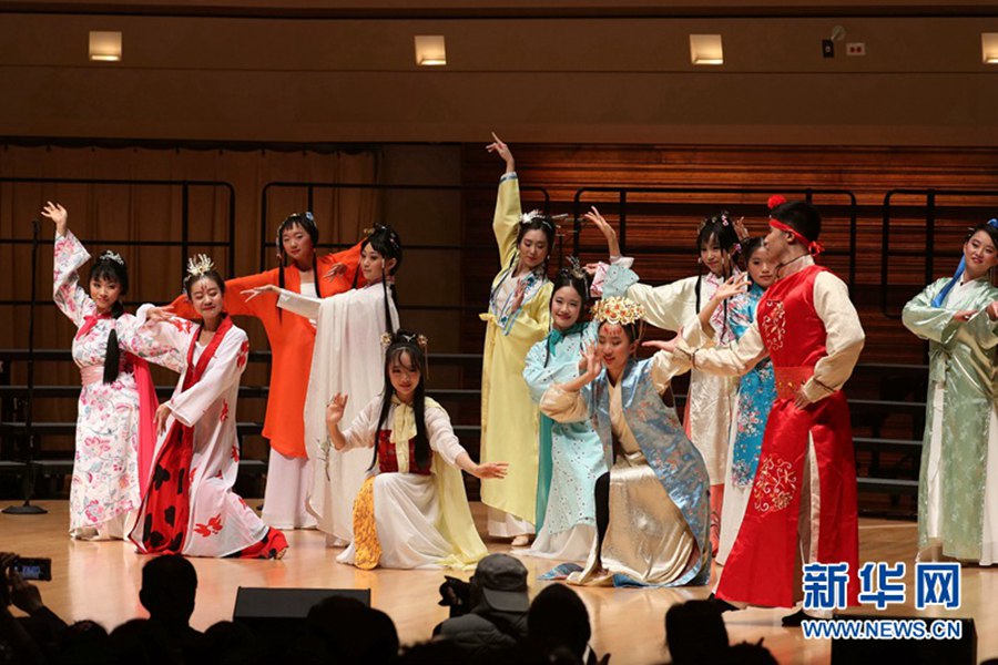 10月7日,在美国芝加哥,华星艺术团的舞蹈演员在音乐会现场表演舞蹈《红楼梦随想》。新华社记者 汪平 摄