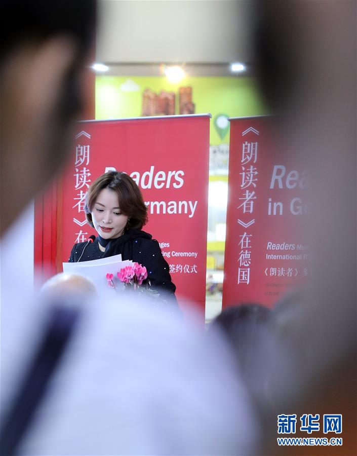 10月10日,在德国法兰克福,中国电视节目主持人董卿在第70届法兰克福书展中国展区出席《朗读者》朗读会。