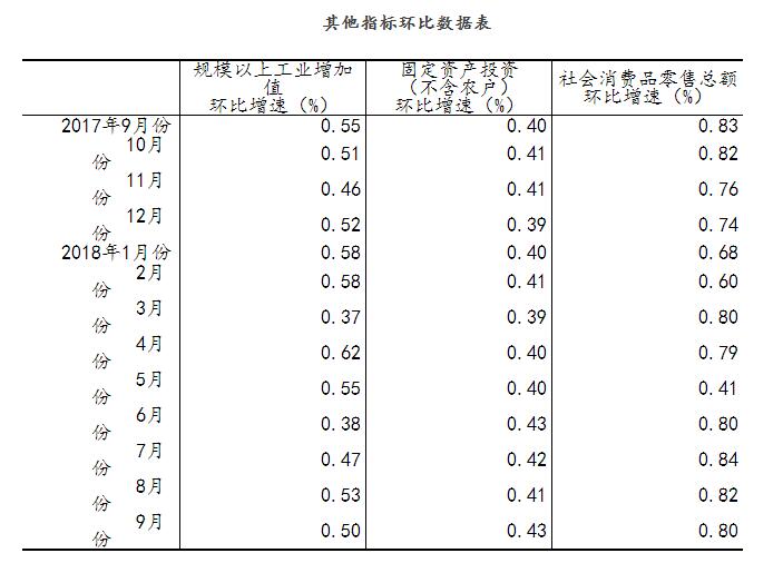 (2)根据季节调整模型自动修正结果,对近一年来各期国内生产总值、规模以上工业增加值、固定资产投资(不含农户)、社会消费品零售总额环比增速进行修订。修订结果及2018年三季度GDP环比数据、9月份其他指标环比数据如下:
