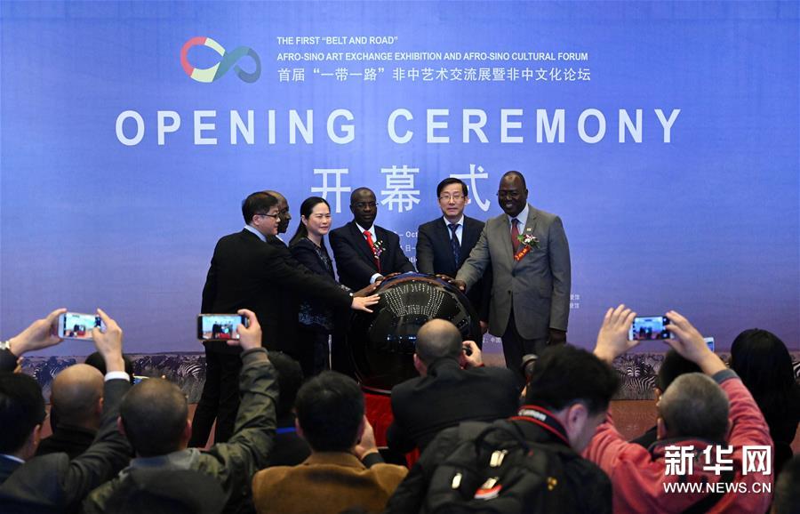 10月24日,嘉宾共同启动首届“一带一路”非中艺术交流展暨非中文化论坛。 当日,首届“一带一路”非中艺术交流展暨非中文化论坛在中国国家图书馆举行。本次展览以“走进肯尼亚·感知新非洲”为主题,参展的110余幅作品中有近一半出自40余位非洲艺术家之手。参加非中文化论坛的嘉宾围绕深化“一带一路”倡议下的非中文化交流进行了发言。 新华社记者陈晔华摄