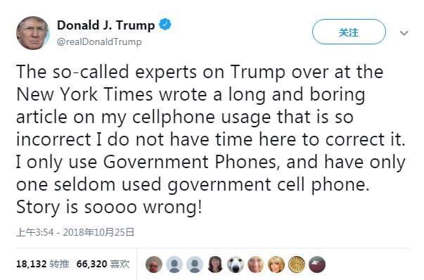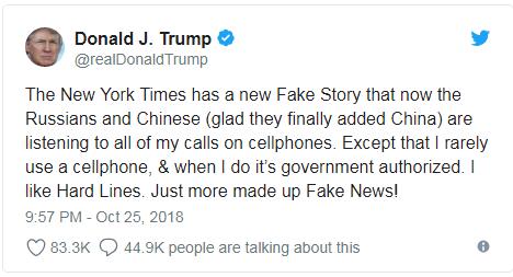 特朗普在推特中说:《纽约时报》又发表了一篇假新闻,说俄罗斯和中国人监听我的手机,可惜我几乎从来不用移动电话,即使用也只用政府授权的电话。又一篇编造的假新闻!