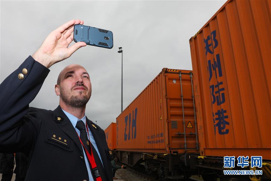 10月24日,在比利时列日集装箱码头,一名工作人员用手机拍摄首趟列日至郑州中欧班列。 一列载有37个集装箱的列车24日从比利时列日集装箱码头出发,缓缓驶向目的地郑州。这标志着联接中国与比利时的第三条中欧班列正式开通。首趟列日至郑州中欧班列运载着汽车零配件、精细化工材料、服装等主要货物,将跨越1.1万公里,预计于12天后到达郑州。