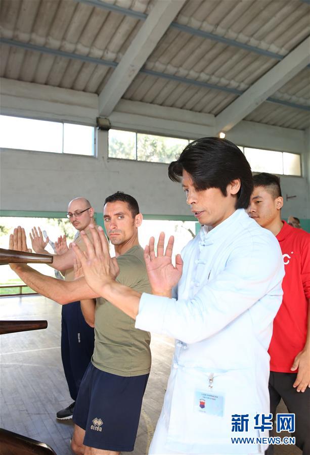 11月13日,在马耳他首都瓦莱塔,郑祖杰(前)向马耳他士兵展示咏春拳。 当日,中国国家级非物质文化遗产咏春拳代表性传承人郑祖杰走进马耳他武装部队,向官兵展示咏春拳。这一活动是马耳他中国文化中心与马耳他武术协会合办的咏春拳系列展示活动之一。 新华社记者 袁韵 摄