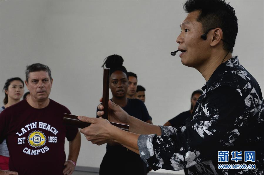11月15日,霍曜飞(右)在古巴哈瓦那国家高等艺术学院为萨尔萨爱好者授课。 新华社发(华金·埃尔南德斯摄)