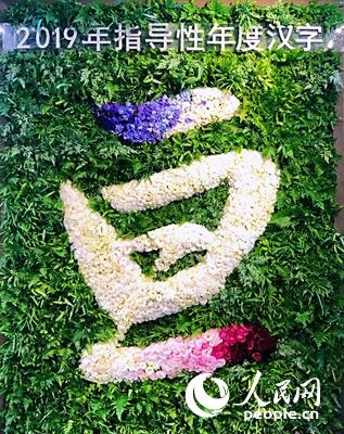 指导性年度汉字“亘”的花艺设计者高意静介绍:“在2019年指导性年度汉字的创作中,我感受到了很多颜色的灵感。2018年的年度流行色是紫色,所以‘亘’字上面一横带着辞旧的一抹紫色,2019年度色彩是白色,所以‘亘’字的主体部分,都用白色的花朵来设计和呈现,白色也是综合了所有颜色的色彩,也蕴含着平衡的意义。‘亘’字下面一横逐渐过渡到粉红色、玫红色和赤色,预示将用赤色迎接2020年。这样的设计,把‘亘’字的造型和年度色彩的变化结合在了一起。而‘亘’的背景,是用鲜活的植物做的设计,植物往下扎根,鲜花往上生长,这也是一种平衡。我感受到所有的颜色带来的平衡与平和,就像人类扎根于地球,受惠于自然,并需要保护自然,与天地融合而一,这是永恒不变的道理。”