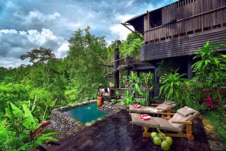 Capella酒店坐落在郁郁葱葱的森林中,会给人一个与众不同的露营体验。通过绳索桥抵达客房,屋内有蜡染墙壁、四柱床和铜浴缸。