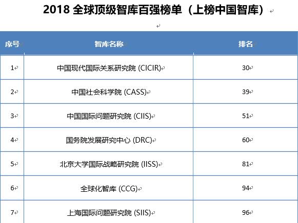 在“2018全球顶级智库百强榜单”中,中国现代国际关系研究院、中国社会科学院、中国国际问题研究院、国务院发展研究中心、北京大学国际战略研究院、全球化智库 (CCG)和上海国际问题研究院共7家再次进入全球顶级智库百强。