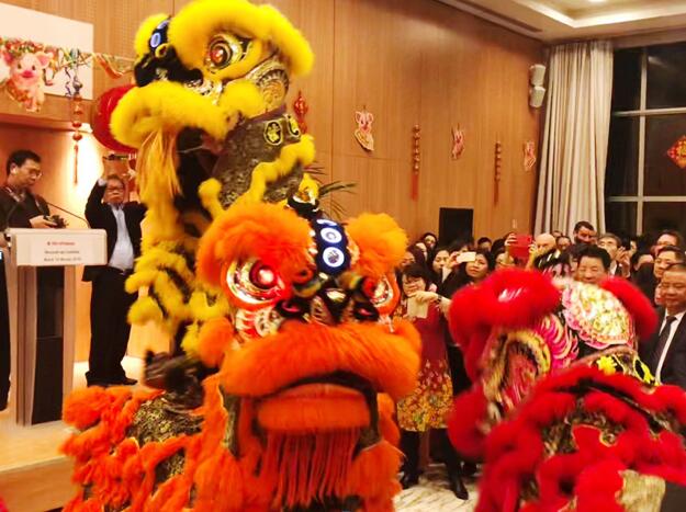 晚会以一场欢快的舞狮表演开始,富有中国传统特色的演出营造了热烈祥和的氛围,会场中的灯笼、中国结等元素也烘托了浓浓的“年味”。