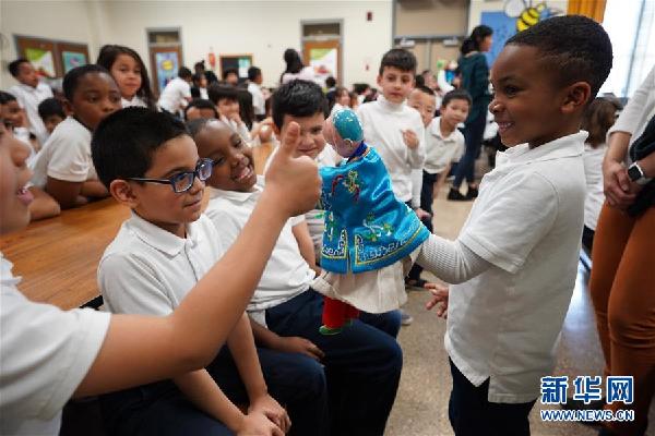 3月20日,在美国马里兰州乔治王子县,潘布兰奇小学的学生们体验木偶戏。新华社记者 熊茂伶 摄