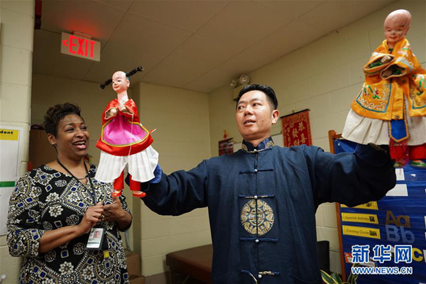 3月20日,在美国马里兰州乔治王子县的潘布兰奇小学,福建漳州布袋木偶戏传承人陈黎晖(右)演示木偶戏。新华社记者 刘杰 摄