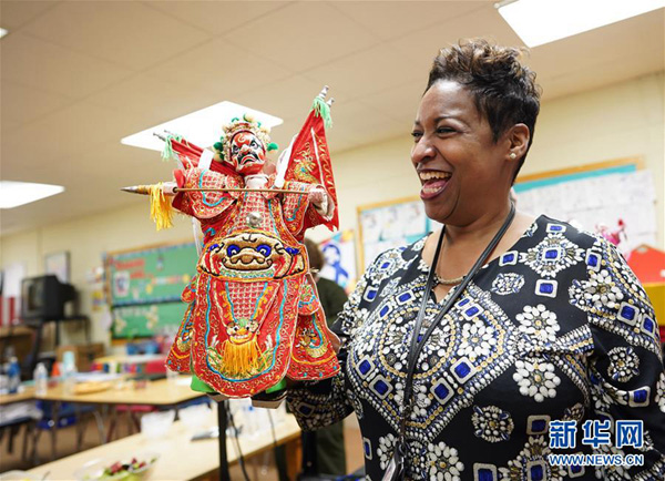 3月20日,在美国马里兰州乔治王子县,潘布兰奇小学校长特里西娅·海尔斯顿体验木偶戏。新华社记者 刘杰 摄