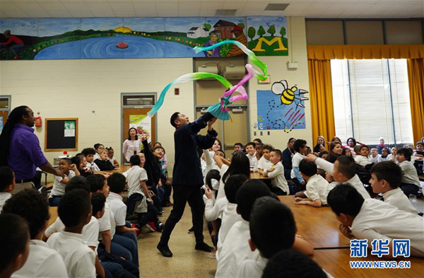 3月20日,在美国马里兰州乔治王子县的潘布兰奇小学,福建漳州布袋木偶戏传承人陈黎晖(中)表演木偶戏。新华社记者 熊茂伶 摄