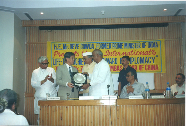2001年6月14日,印度前总理德夫高达代表印度国际团结基金会授予周刚大使“终身外交成就奖。(图片由受访者提供)