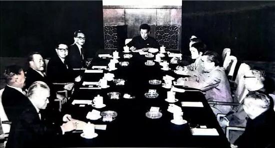 资料图片:1972年9月,周恩来总理(桌右侧正中)在人民大会堂与日本首相田中角荣会谈,桌末端为廉正保