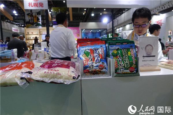 第二届进博会8.2馆北海道展区的展台上摆放着日本大米和拌饭料。(人民网记者王晓霞摄)