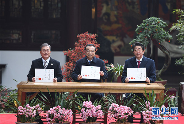 这是三国领导人共同出席“中日韩合作20周年纪念封”发行仪式。新华社记者 张领摄