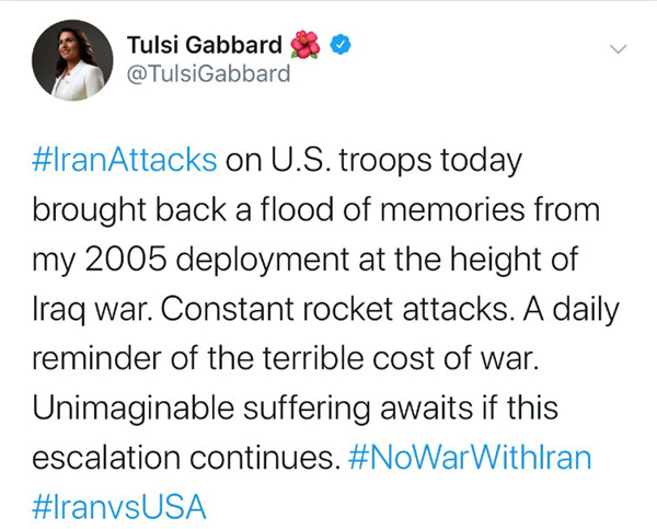 译文:伊朗今日对美军的袭击唤起我在2005年伊拉克战争打得最为激烈之时的部署作战记忆,火箭弹攻击不断。每天都提醒着人们战争的惨痛代价。如果这种对抗继续升级,将会带来无法想象的痛苦。(此人为美国民主党女议员图尔西·加伯德,曾在美国陆军服役,2004年到2005年被部署在伊拉克)