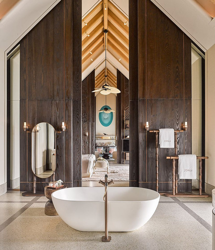 Joali度假胜地的宽大浴室,配备可容纳两个人的大型独立浴缸。