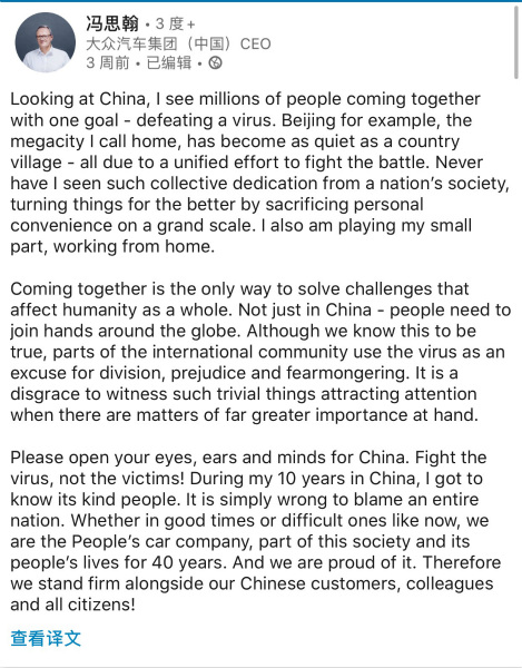 “在这个非常时期,我们坚定地与顾客、员工和整个社会站在一起,尽可能减少疫情对业务和对整个中国的影响。”冯思翰说,“我认为,不论是中国作为一个国家还是大众作为一家企业,都必须在恢复经济活动与遏制疫情发展之间找到平衡。”