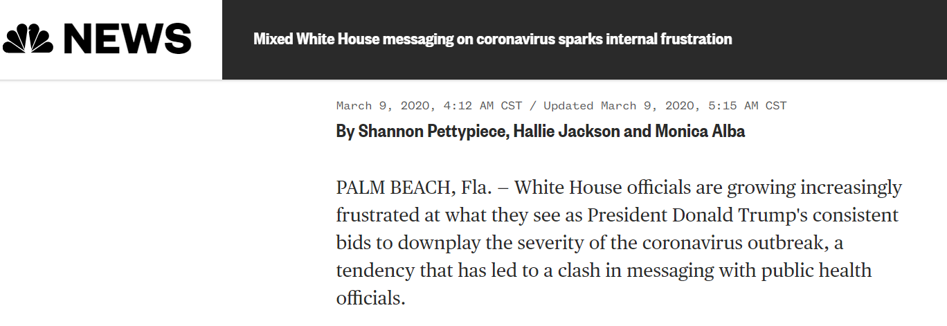 美国NBC报道称,白宫对疫情释放出的信息混乱,令民众恐慌。