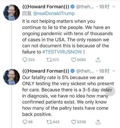 事实上,政府和专家在疫情信息发布上的不一致,已令许多民众感到恐慌。网民Howard Forman就在推特上表示,向民众不断撒谎于事无补。“疾病可能在美国大流行,有上万人感染。唯一没有得到这个数字的原因就是:没法检测!”这条评论被点赞5000多次。他还表示,目前美国只测试了症状最严重的病人,而且确诊还有3-5天的时间差,我们不知道有多少人已经感染而不自知。
