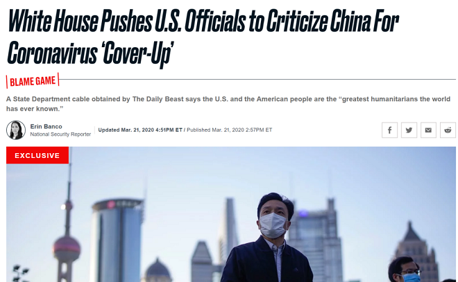 美国“每日野兽网站”揭露,随着疫情在美国本土迅速扩散,白宫发起了一项宣传计划,不少联邦政府机构都被要求集中攻击中国造成了疫情全球流行。该网站的消息是从两名美国官员和一份政府电报中得到的。