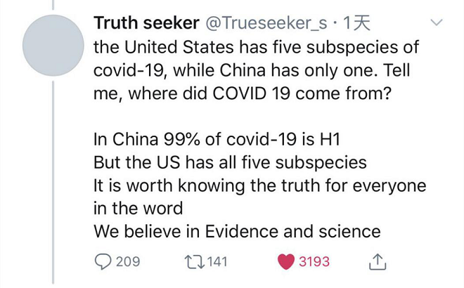 名为“真相探求者”的账号在特朗普推特留言说:美国拥有全部病毒的5种类型,而中国只有一种。病毒究竟从哪来的?世界上的每个人都应该知道真相。我们相信证据和科学。