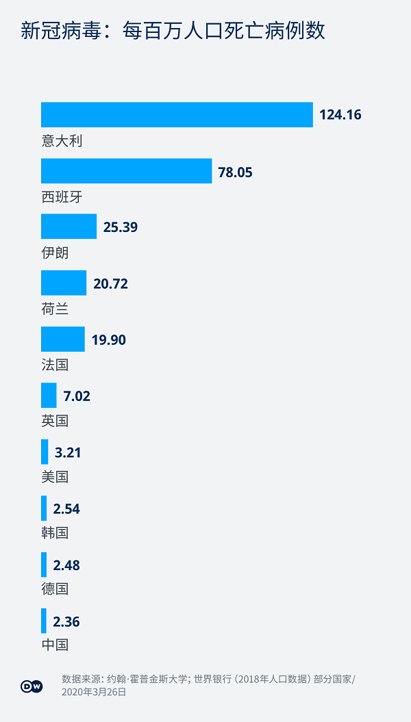 3月22日,德国总理默克尔则由于其医生感染了新冠病毒开始自我隔离。3月26日,德国确诊人数超过39500人,死亡222人。但相对来讲,此时意大利确诊人数约为75000人,却有超过7500人死亡,西班牙确诊病例在56000以上,死亡接近4100人。