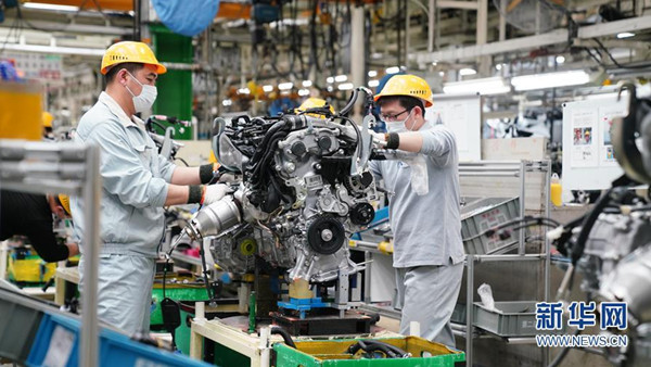 工人在位于天津开发区的一汽丰田生产基地进行生产作业(2月18日摄)