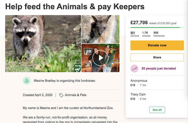 由于大半个春季都没有足够收入,许多动物园面临严重财务危机。英国诺森伯兰郡国家公园在官网开通众筹页面,向公众请求帮助。截至当地时间4月16日凌晨3时,已向901位捐助者筹集27706磅。除众筹外,诺森伯兰郡国家公园还推出多项活动,如鼓励游客提前购买年票、注册会员、领养动物等,还开通了YouTube频道以增加更多关注。