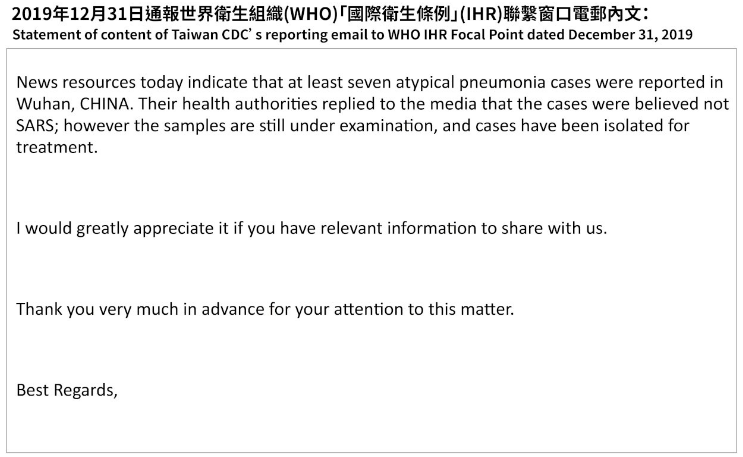 2019年12月31日,武汉市对外发布不明原因肺炎疫情情况通报后,台卫生部门向国家卫健委发函了解武汉卫健委公布的信息,国家卫健委通过两岸医药卫生合作协议联系窗口及时予以了书面回复。同日,台卫生部门向世卫组织发送所谓“预警”邮件(见下图)。该邮件未提及“人传人”,主要是向世卫组织了解情况。事实很清楚,大陆方面首先公布信息,台卫生部门再进行转述,不存在所谓台方首先向世卫组织报告的情况。