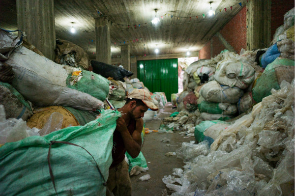 2012年4月18日,一名工人在埃及首都开罗扎巴林区的一家塑料垃圾回收作坊里搬运垃圾。(新华社记者李木子摄)