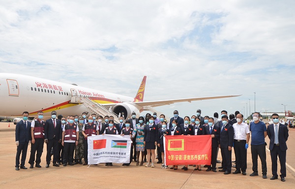 2020年8月19日中午,应南苏丹政府邀请,由中国政府派出的赴南苏丹抗疫医疗专家组乘包机抵达朱巴。第八批中国(安徽)援南医疗队同机抵达。中国驻南苏丹共和国大使馆 供图