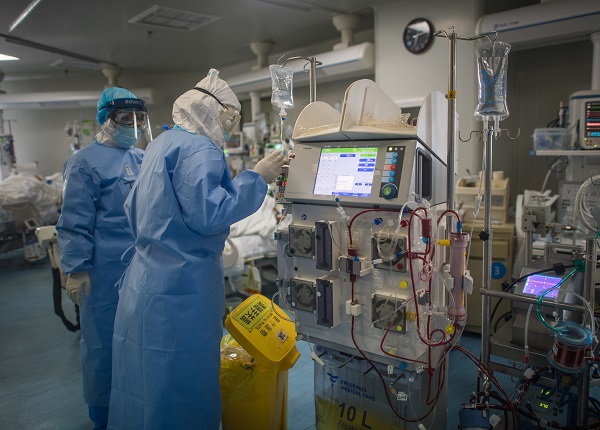 3月19日,在武汉市肺科医院重症监护室,浙江医疗队队员丁杨(左)与同事为患者做ECMO(体外膜肺氧合)治疗。 新华社记者 肖艺九 摄