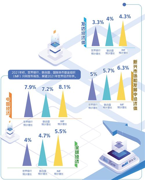 展望未来,随着新冠疫苗研发和接种不断取得新进展、各国财政货币政策支持、疫情管控措施谨慎放宽,全球经济正迎来复苏。国际机构最新报告预测,今年全球经济增长4%到5%。世界银行较为谨慎,考虑到疫情引发的不确定性正在使全球贸易和投资量减少,预计增长4%。IMF显得更为乐观,预计今年全球经济增长5.5%。