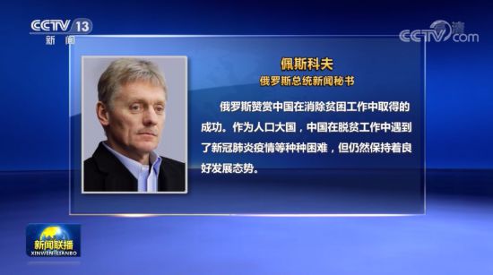俄罗斯总统新闻秘书佩斯科夫表示,俄罗斯赞赏中国在消除贫困工作中取得的成功。作为人口大国,中国在脱贫工作中遇到了新冠肺炎疫情等种种困难,但仍然保持着良好发展态势。多国人士表示,对全世界而言,中国成功消除绝对贫困是具有重要意义的范例。