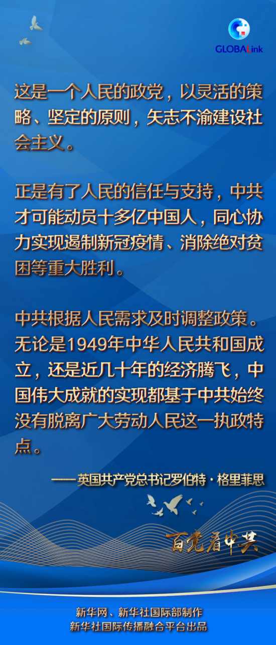 格里菲思日前接受新华社记者视频连线专访时表示,对于中国共产党和中国人民来说,过去一百年堪称翻天覆地、意义重大。中共之所以能成功带领中国取得辉煌成就,“核心秘诀”是始终保持和广大人民的紧密联系,时刻不忘为人民服务的初心,得到了人民的高度信任和广泛支持。
