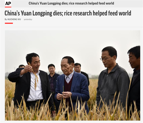美联社发表题为《中国科学家袁隆平去世,其水稻研究帮助养活全球人口》的文章称,袁隆平一生致力于水稻研究,在中国家喻户晓,被誉为“杂交水稻之父”,并且在2004年获颁世界粮食奖。袁隆平的研究不仅帮助中国从粮食短缺迈向了粮食充足供应,他和他的团队还与数十个国家开展合作,帮助他们解决粮食安全和营养不良问题。即使在晚年,袁隆平也没有停止研究工作。