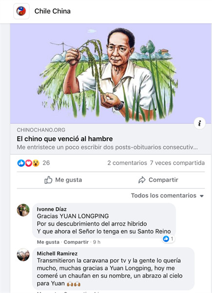 智利网友对袁隆平的贡献表达感谢。图片来源:Facebook“智利-中国(ChileChina)”小组官方账号截图