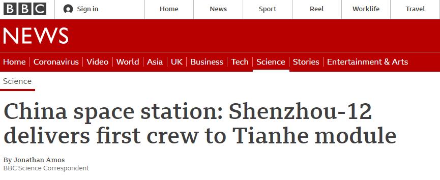 英国广播公司报道说,神舟十二号载人飞船将3名航天员送往天和核心舱,他们成为中国自主建设的常驻空间站的首批“住客”。