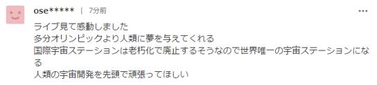 日本网友表示,看了直播很感动,中国未来自主建设的空间站或将成为世界唯一的空间站,希望中国引领人类太空开发,继续加油。
