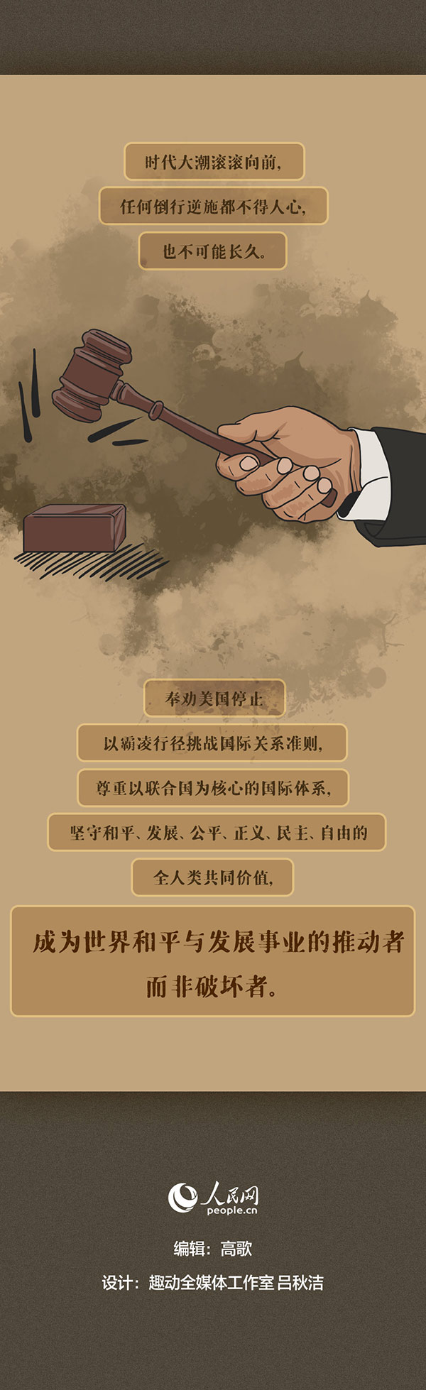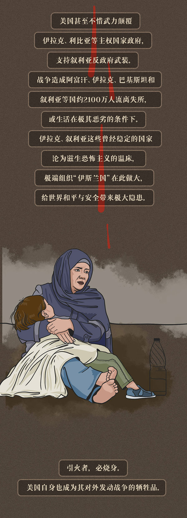 编者按:美国前总统吉米·卡特曾指出,美国是世界历史上最好战的国家。美国建国240多年来,仅有16年没有打仗。由于执迷于对外干涉和制度输出,美国的行为让多少个原本平静的国家山河破碎、生灵涂炭,无数家庭妻离子散、骨肉分离。时代大潮滚滚向前,任何倒行逆施都不得人心,也不可能长久。奉劝美国停止以霸凌行径挑战国际关系准则,尊重以联合国为核心的国际体系,坚守和平、发展、公平、正义、民主、自由的全人类共同价值,成为世界和平与发展事业的推动者而非破坏者。