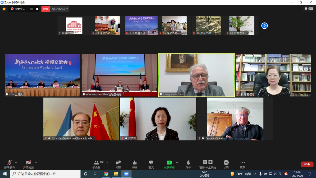 人民网巴黎7月10日电(记者刘玲玲) 中国驻法国大使馆和驻马赛、斯特拉斯堡、里昂总领馆9日与新疆维吾尔自治区政府共同举办“新疆是个好地方”视频交流会。法国政党、议会、工商、科教、文化、宗教等各界代表、多国驻法使节或高级外交官以及旅法侨界代表等100余人参会。