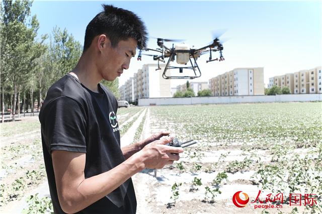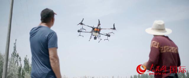 5月下旬,库尔勒尉犁县的阳光已经非常炎热,照在地里让人睁不开眼睛。吐玉洪·吾吉家的棉田里,无人机正在给棉苗喷洒农药。绿色的棉苗在无人机起飞带起的风里一阵摇曳。