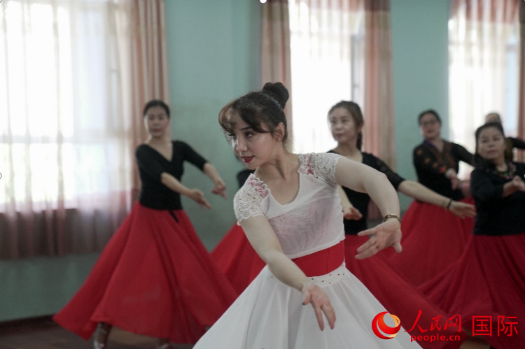 古丽巴娜·依明正在教学员跳舞 人民网 马天翼摄